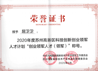 屈卫卫总经理荣获2020年度苏州高新区科技创新创业领军人才计划“创业领军人才(领军)”称号