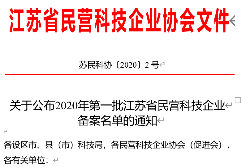 根据《江苏省发展民营科技企业条例》等有关规定,经一系列流程,2020年第一批1598家江苏省民营科技企业备案名单予以公布,我司成功当选