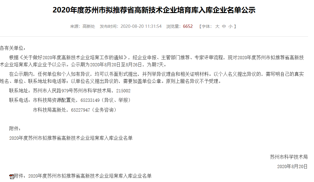 又一入选!2020年度苏州市省高新技术企业培育库入库企业